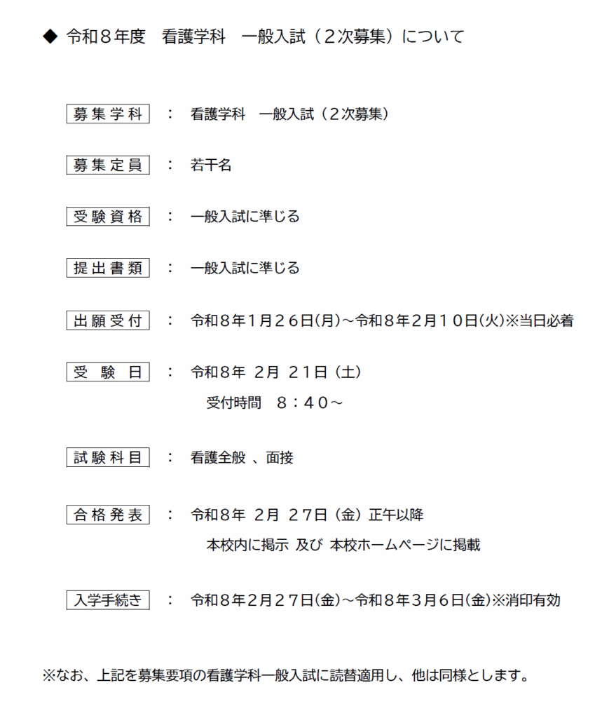 看護学科 一般(2次)入試の募集要項は、こちらからご覧になれます。